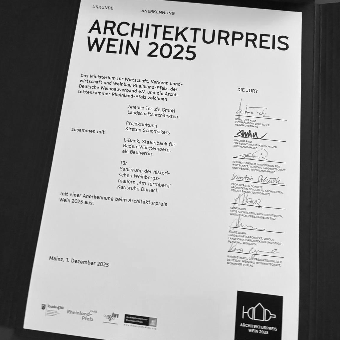 Bei der Preisverleihung des Architekturpreises Wein in Mainz wurde unserem Projekt Sanierung der Weinbergmauern im Staatsweinguts Durlach eine Anerkennung zugesprochen. Wir freuen uns mit unserer Projektleiterin Kirsten Schomakers über diese Auszeichnung!