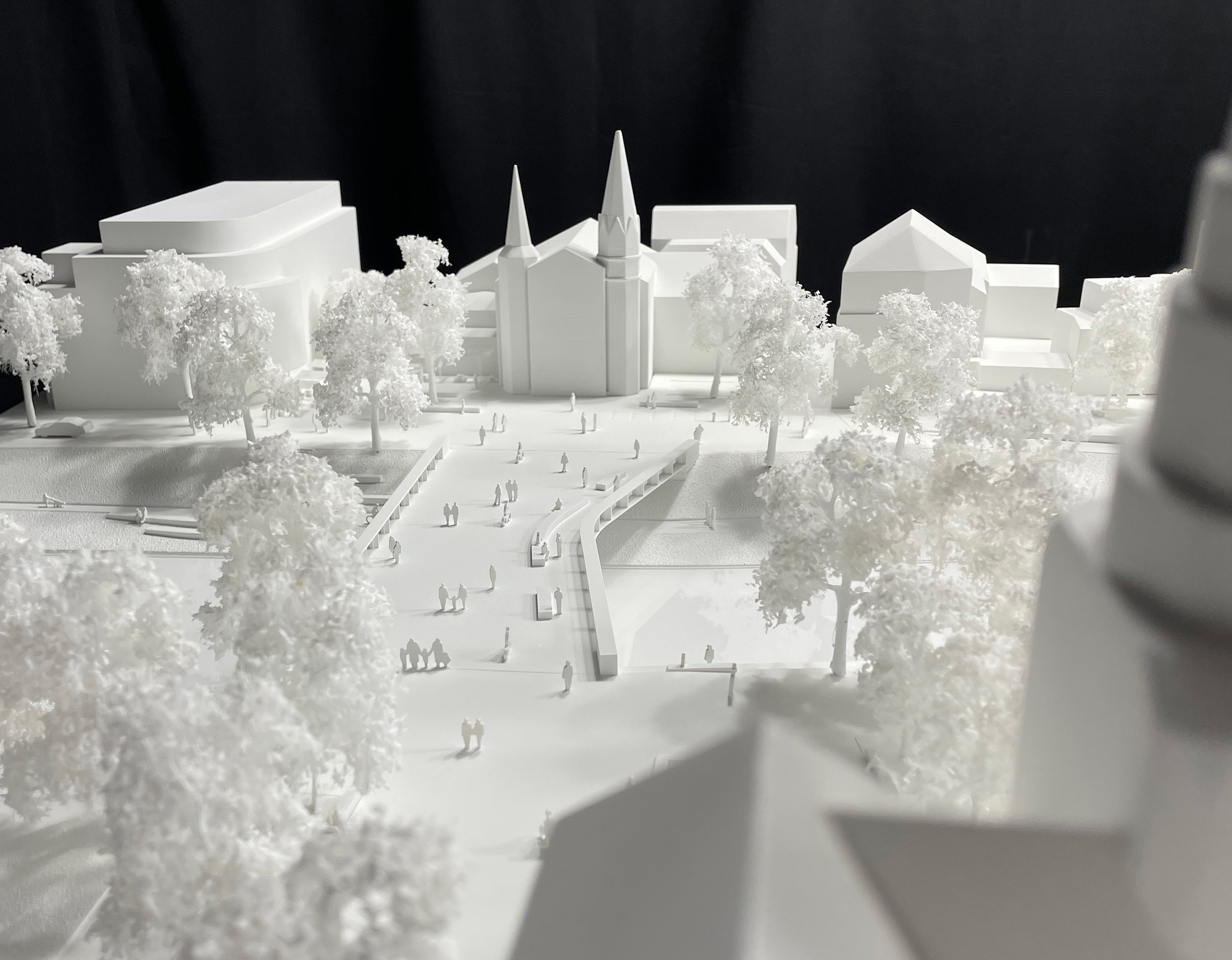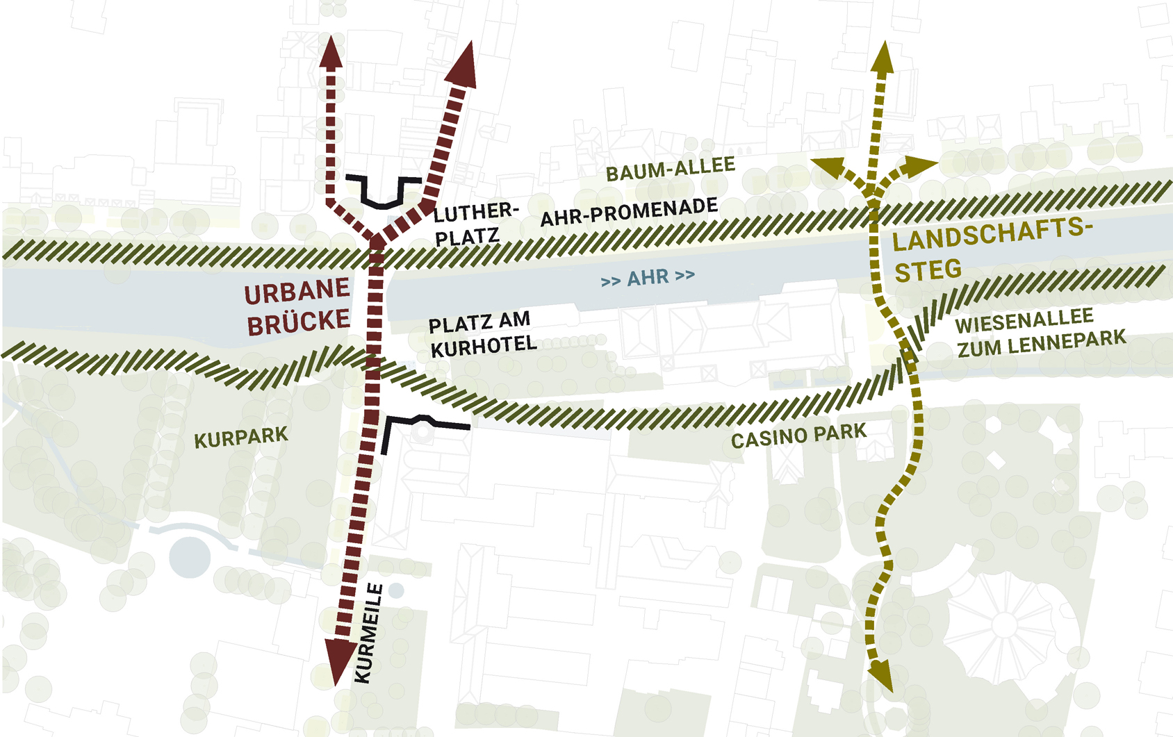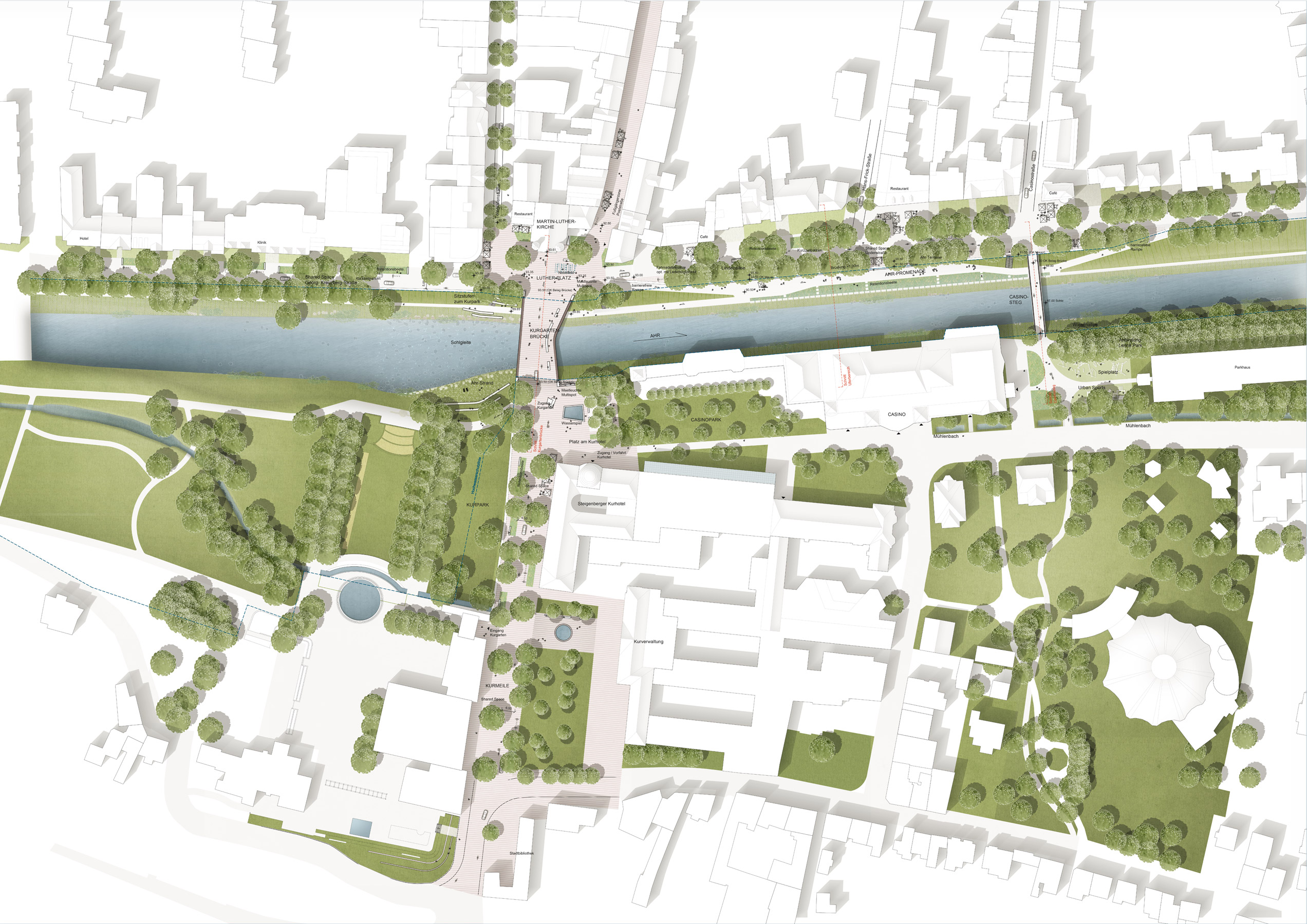 Die beiden neuen Brücken sind nicht nur Querungsmöglichkeiten, sondern schaffen eine räumliche Kontinuität über die Ahr hinweg. Dabei wird auf eine Brüstungsmauer parallel zum Ufer verzichtet, um Blick und räumliche Wahrnehmung über das Wasser hinweg zu ermöglichen.