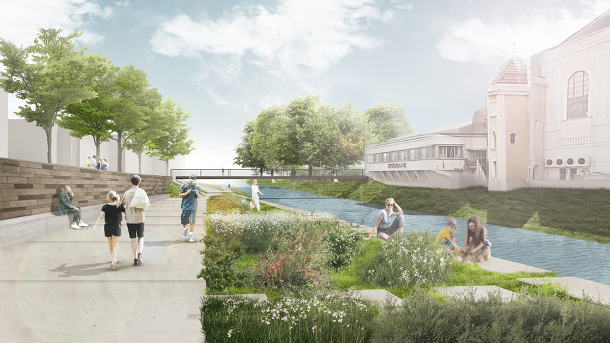 Die Brücken werden in das vorhandene Wege- und Stadtsystem eingebunden und sind unterschiedlich ausgeprägt, um den jeweiligen ortsspezifischen Anforderungen gerecht zu werden. Bei außergewöhnlichen Hochwasser- ereignissen werden sie durch ein hydraulisches System angehoben, um den erforderlichen Durchfluss- querschnitt zur Verfügung zu stellen.