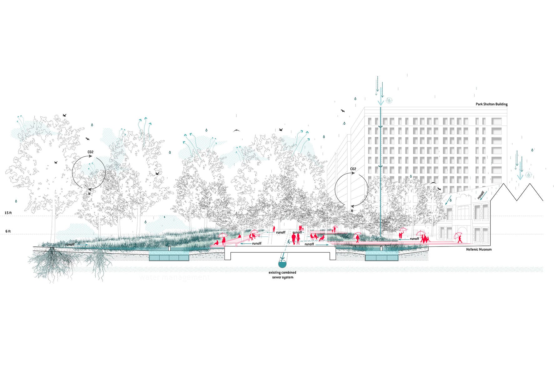 In Detroit konzipiert Agence Ter 28 Hektar lebendigen Boden für ein Stadtquartier, das durch seine Kultureinrichtungen geprägt ist. Der öffentliche Raum wird hier zum "lebendigen Körper", einem urbanen Organismus, der der Austausch zwischen Kunst, Wissenschaft und Natur fördert und Natur in die Innenstadt bringt. Durch eine gemeinsame äußere Erschließung werden zwölf Kunst-, Bildungs- und Kultur- einrichtungen miteinander verknüpft. Im Innenbereich verwischen die Grenzen zwischen den Gebäuden und Natur und Kultur können sich in den Erdgeschossen begegnen. Weitere Elemente der städtischen „Anatomie“ sind neues Wassermanagement, die Förderung der Biodiversität und eine einheitliche Materialität.
