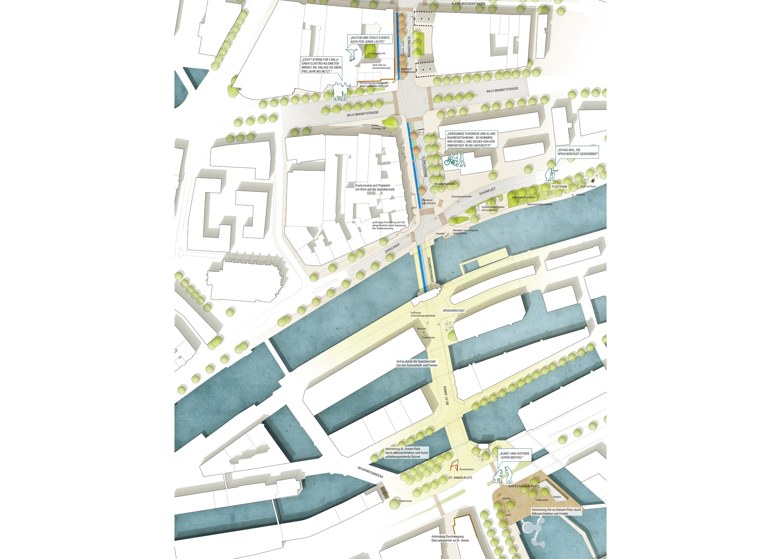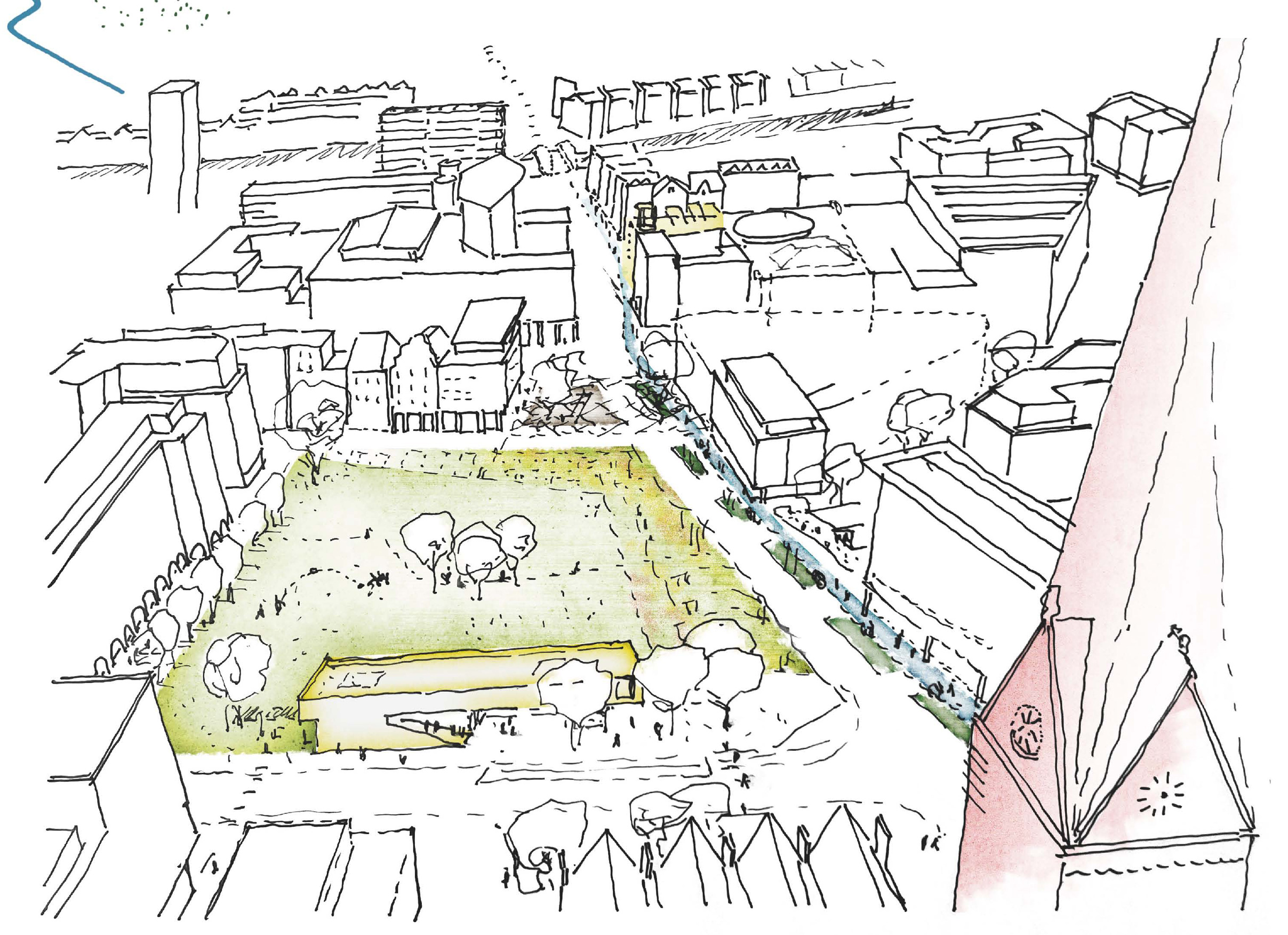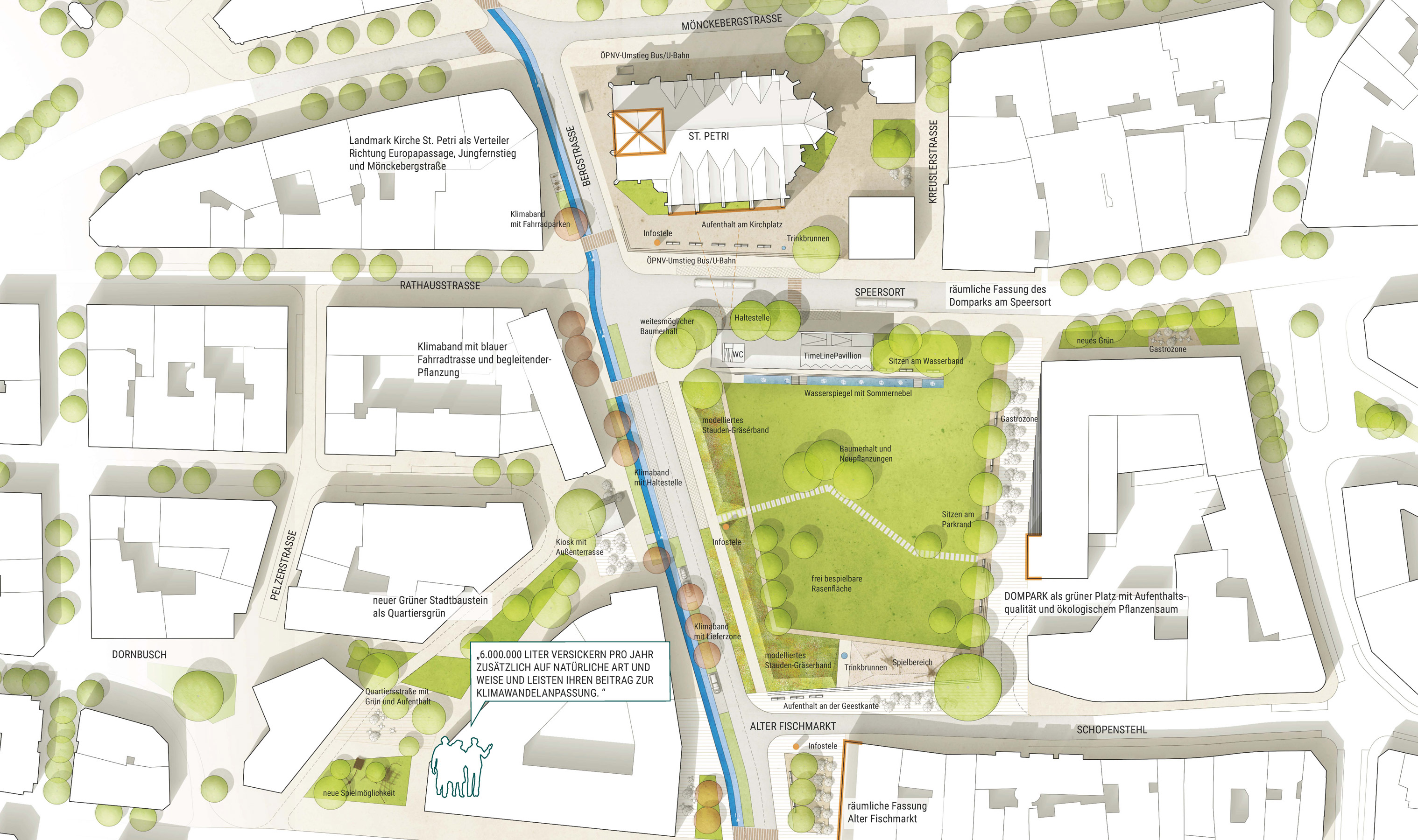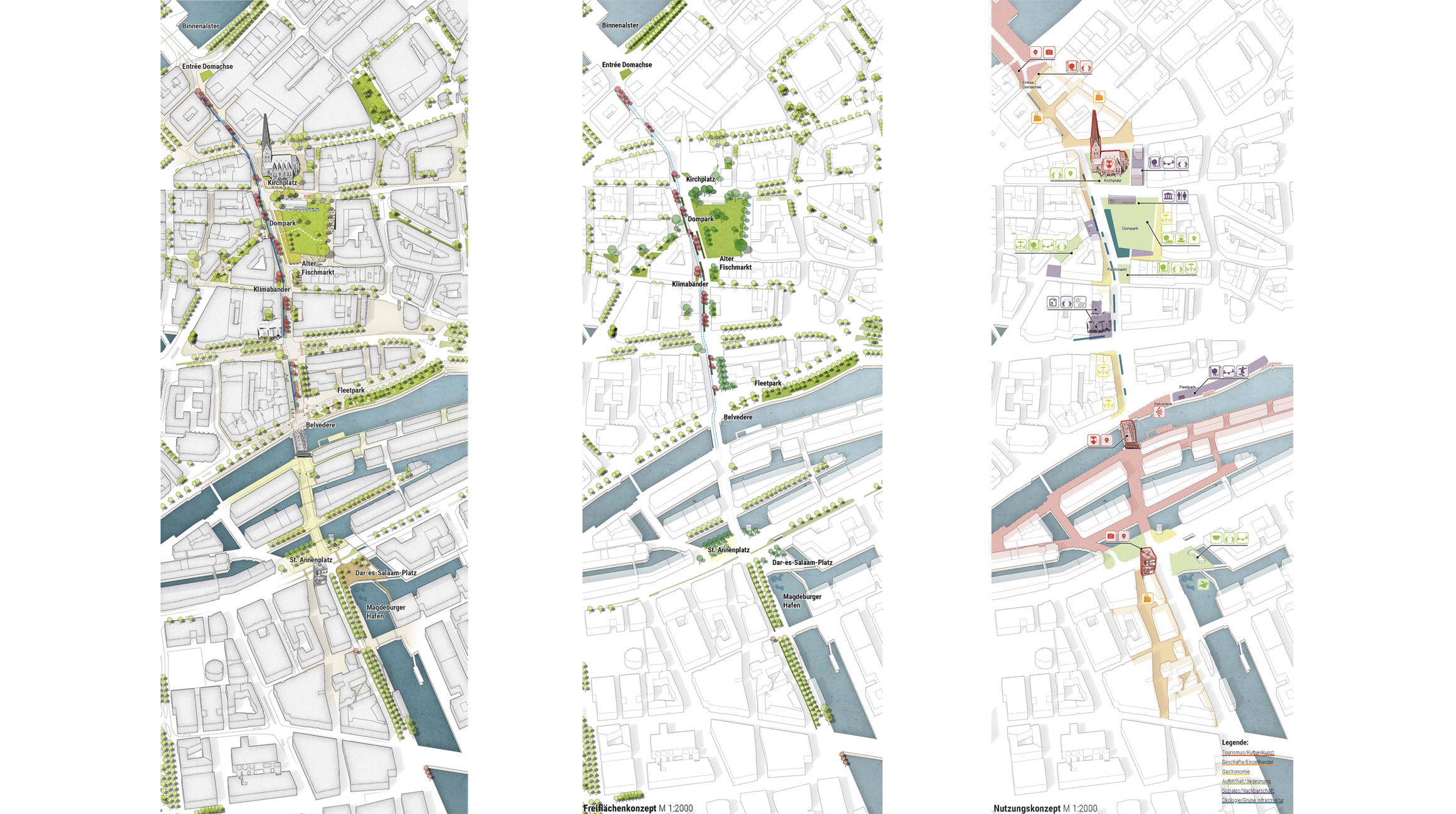 Dazu werden Verkehrsstrukturen gebündelt und die nicht motorisierten Verkehre priorisiert. Durch Entsiegelung entstehen grüne Bänder, die die Stadträume miteinander verbinden und das Stadtklima verbessern. Historische Stadtbausteine werden integriert, der Dompark in seiner Größe maximiert und um einen multifunktionalen Pavillon ergänzt. Ein Parkhaus erhält durch zusätzliche Funktionen eine neue Außenwirkung mit urbaner Strahlkraft.