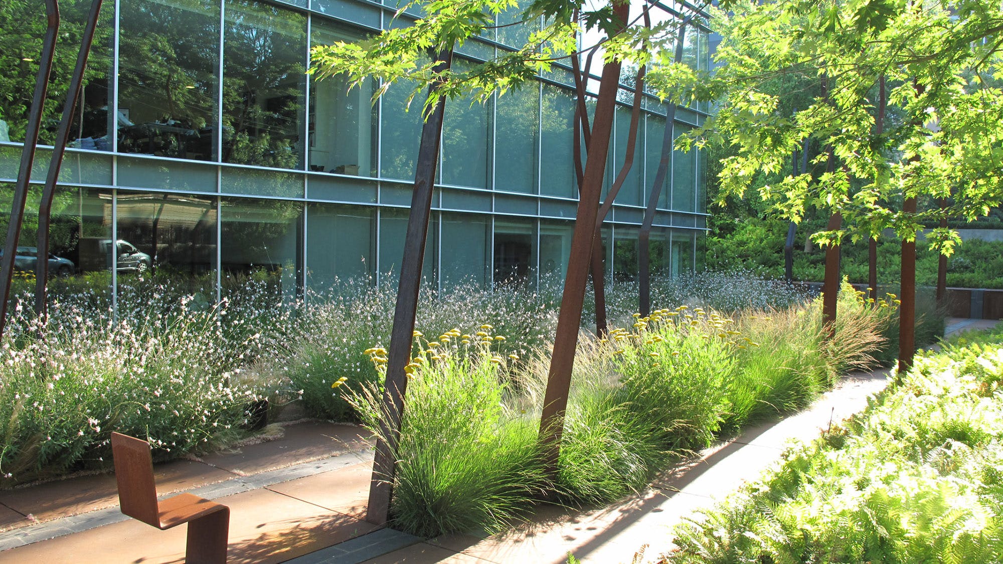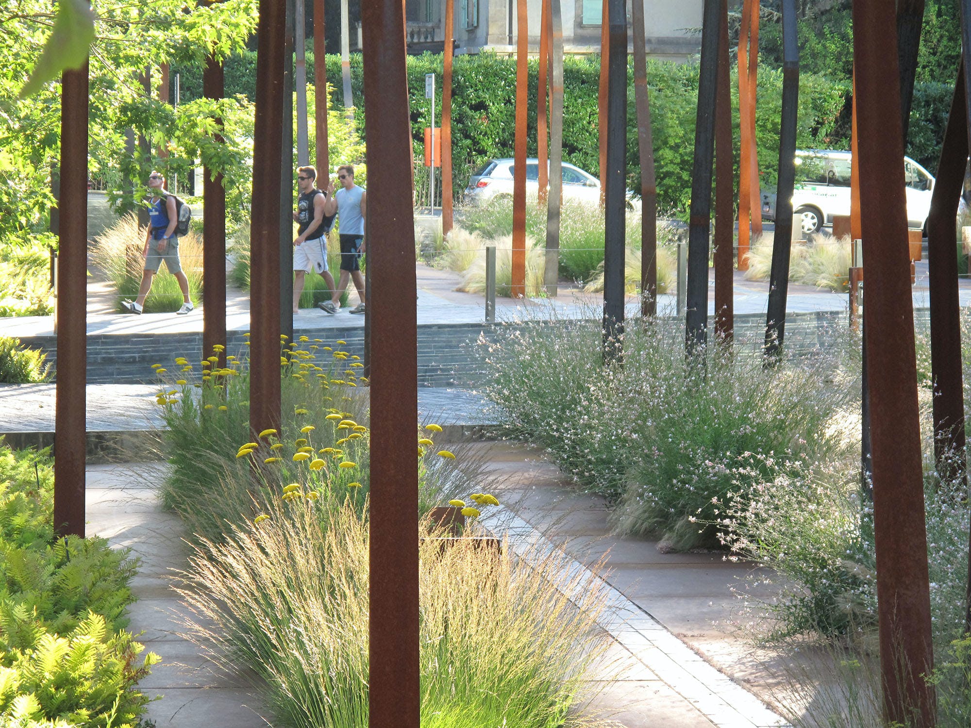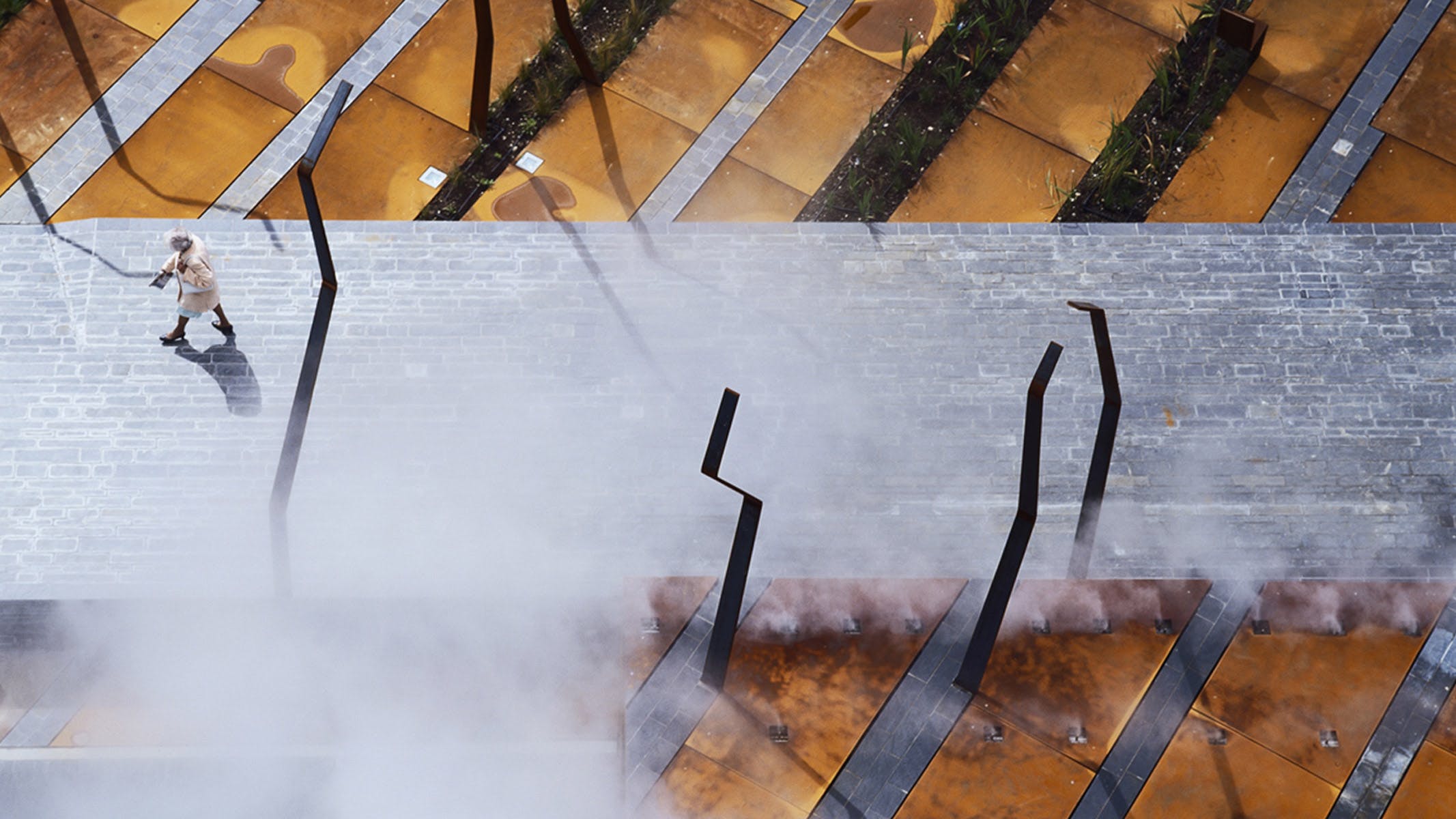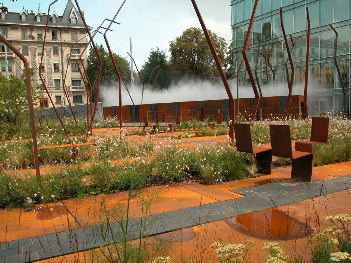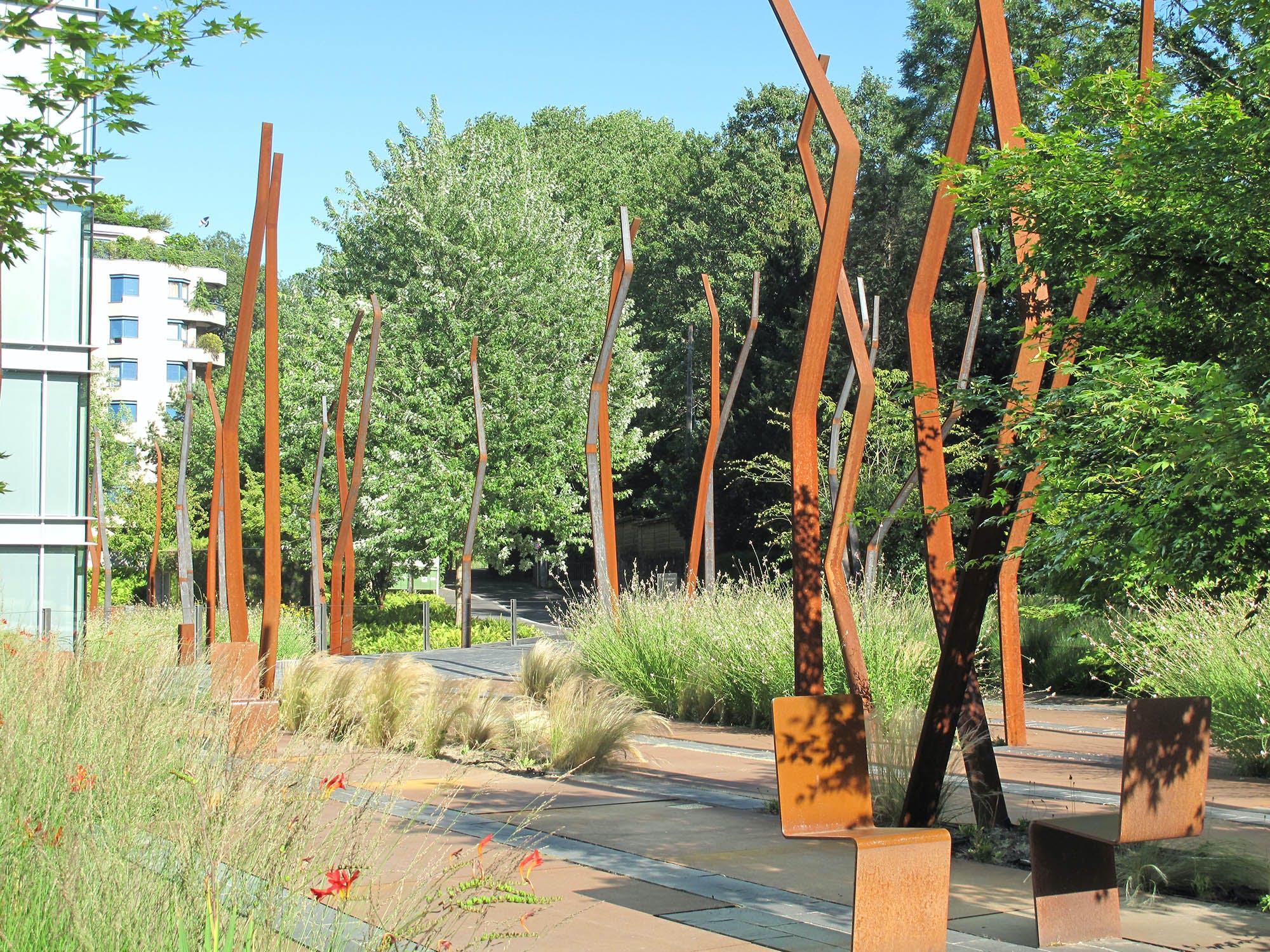 Das Projekt Floor Work lebt durch die Auseinandersetzung mit dem Boden, manipulativen Eingriffen und dem Gegensatz zwischen mineralischen und natürlichen Materialien. Rote Corten-Stahl-Bänder erstrecken sich in parallelen Bahnen über die gesamte Fläche des Gartens und überformen dessen Topografie. An ihren Ende falten sie sich in die Höhe und verwandeln sich in Sitzgelegenheiten oder bis zu sieben Meter hoch aufragenden Figuren. Zwischen den Stahlbändern öffnen sich feine Streifen, die den darunter verborgenen Erdboden freilegen und den Garten mit Wasser und Vegetation zum Leben erwecken.