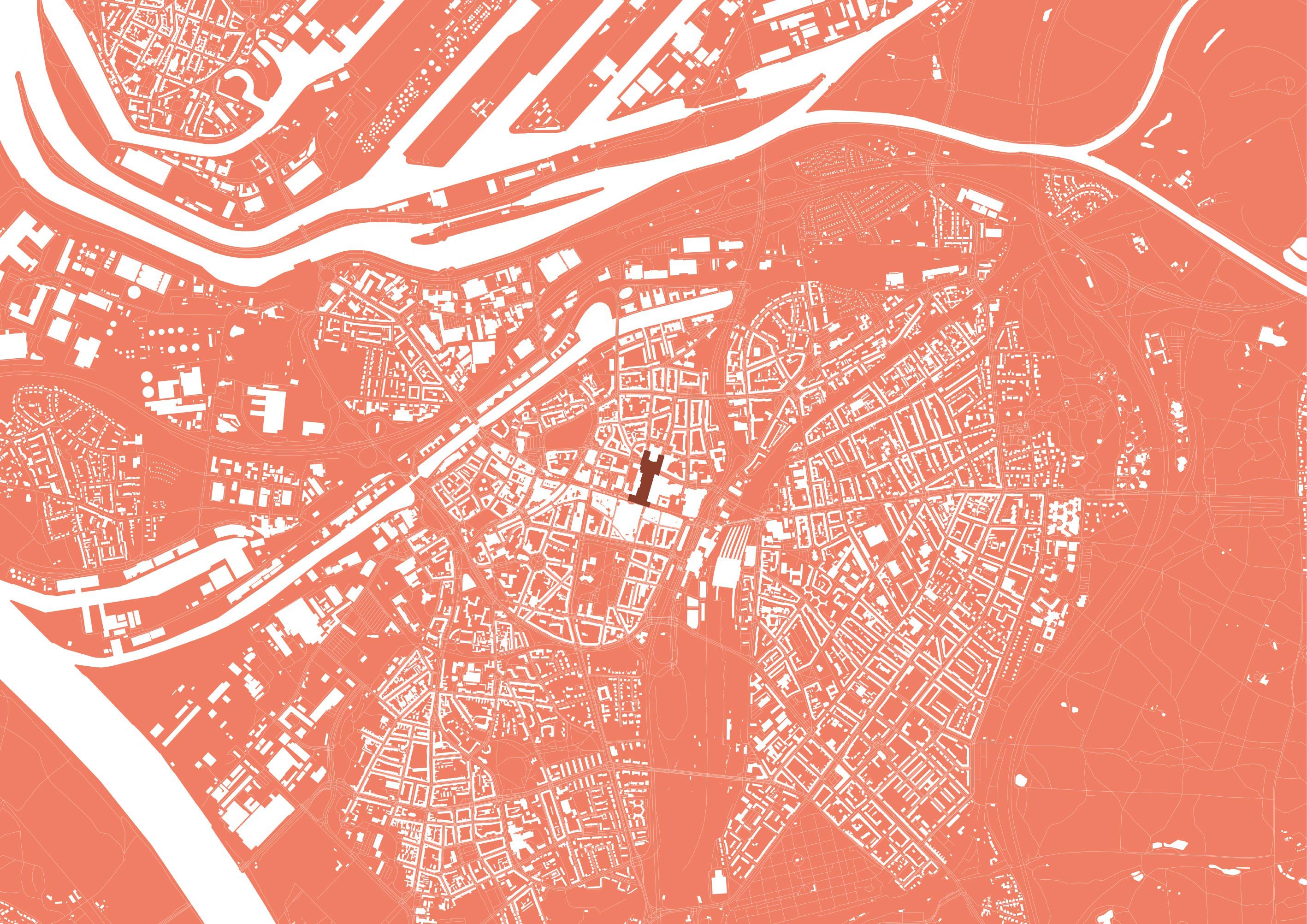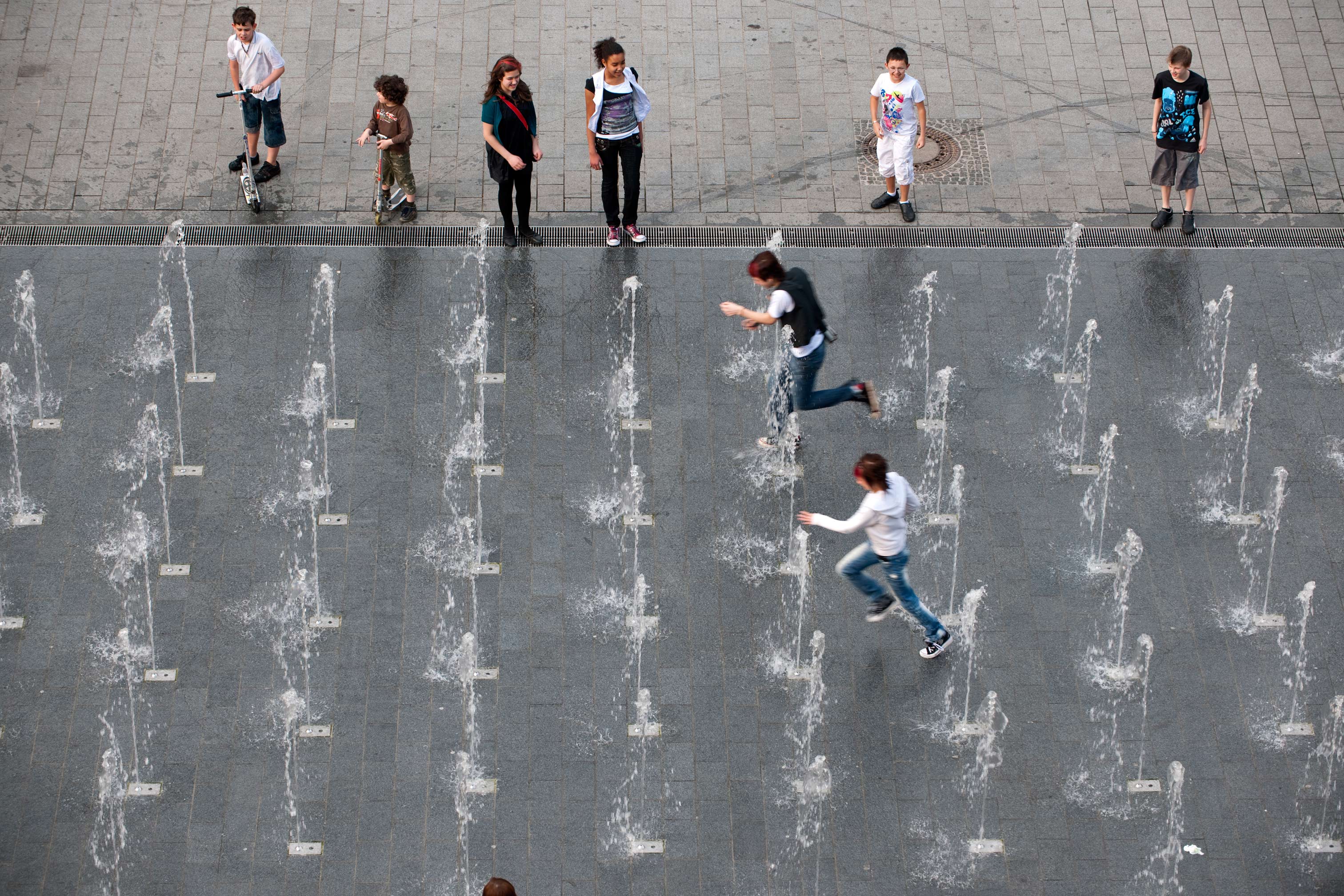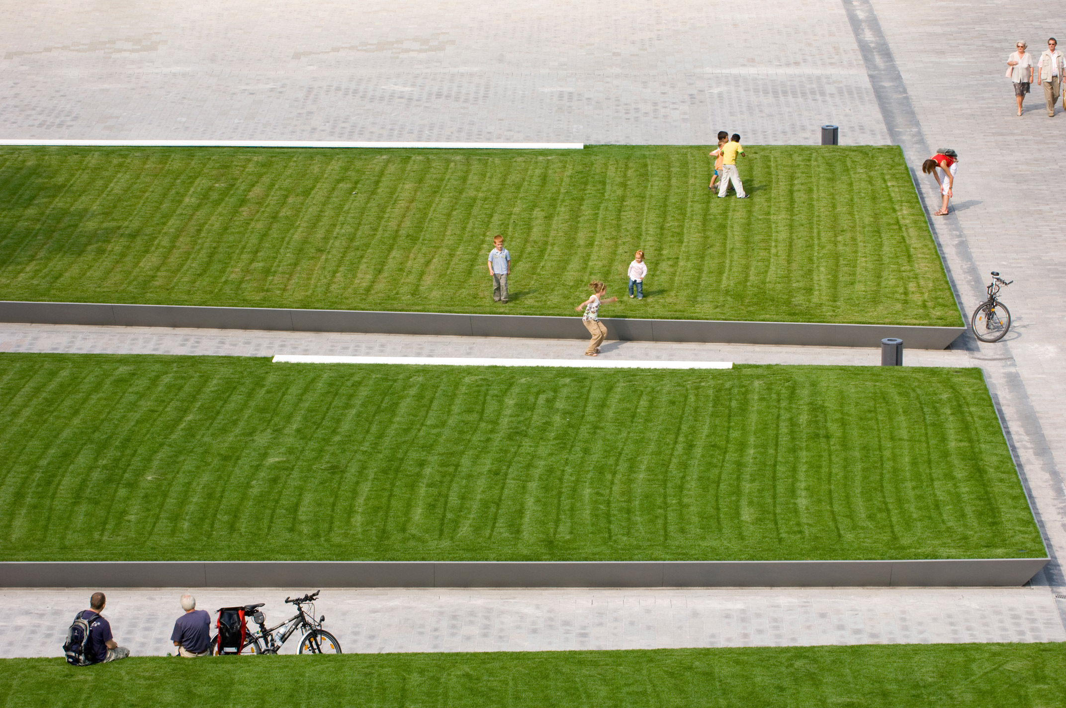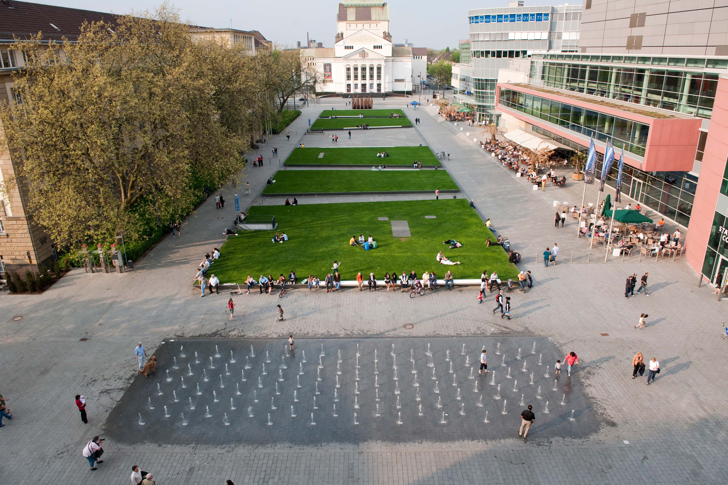 Der zentrale Platz wurde umstrukturiert, um das Zentrum der Innenstadt von Duisburg zu stärken. Jetzt unterstreicht sein neuer Charakter die bestehenden Qualitäten. Gleichzeitig wurden die Höhen angepasst und ein einheitlicher Bodenbelag vorgesehen, um eine konzeptuelle Einheit zu gewährleisten. Ein grüner Teppich aus fünf Rasenelementen liegt leicht erhöht über dem Platzniveau und scheint so zu schweben. Nachts verstärkt sich dieser Effekt durch die im Boden eingelassene Beleuchtung. Am südlichen Rand beleben Wasserspiele den Platz, der dadurch noch an Attraktivität und Aufenthaltsqualität gewinnt.