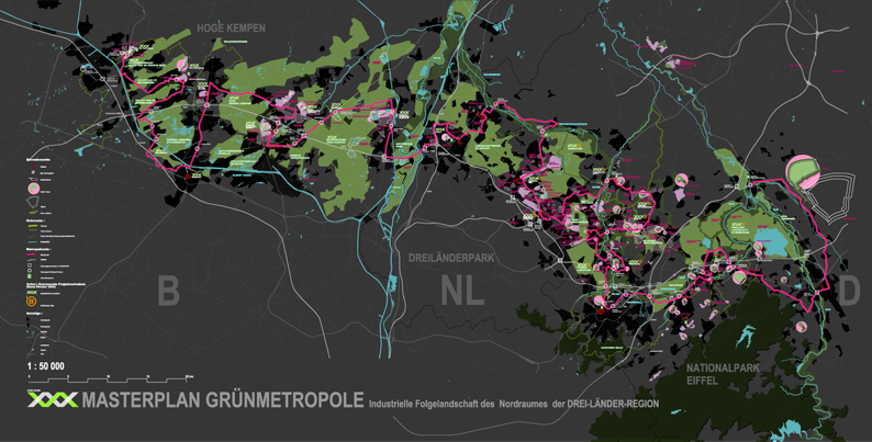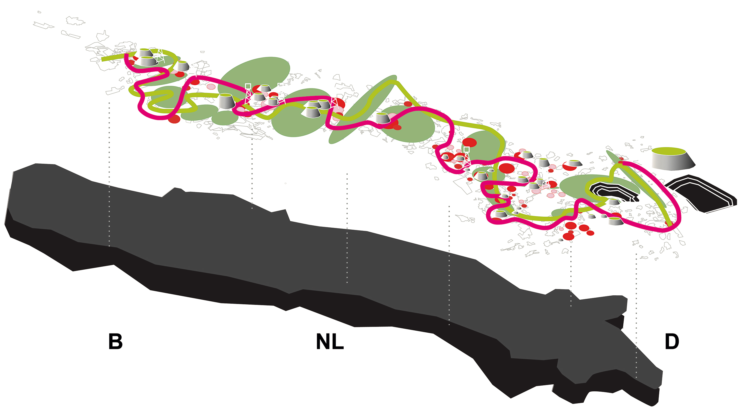 Auf der Basis eines im Boden verborgenen Kohleflözes, der unter den drei Ländern verläuft, entwickelt Agence Ter eine Strategie für die Folgelandschaft der industriellen Nutzung. Durch das Sichtbarmachen der unsichtbaren Schicht entsteht das Projekt an der Oberfläche wie ein Echo auf das Nicht-Sichtbare, verbindet die bislang fragmentierten Räume miteinander und lässt eine grenzübergreifende Identität entstehen.