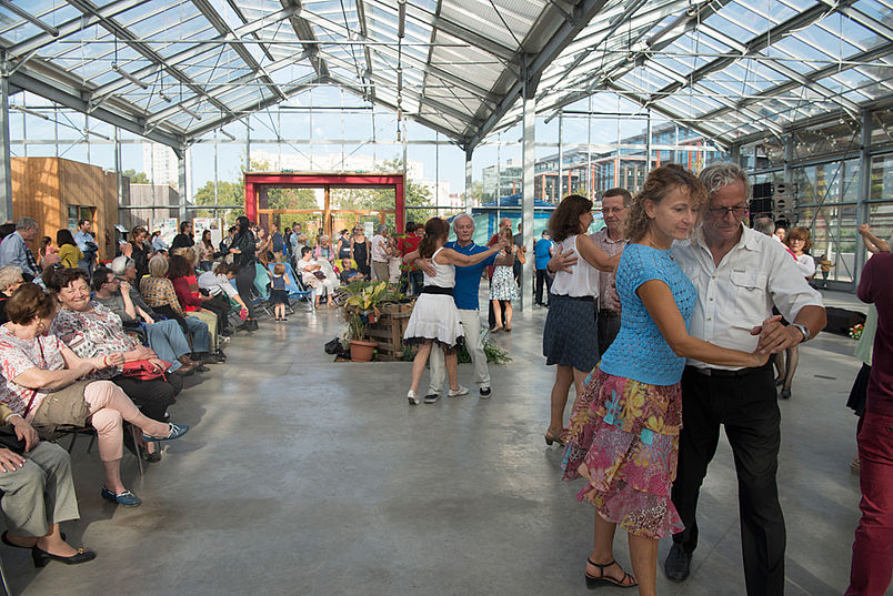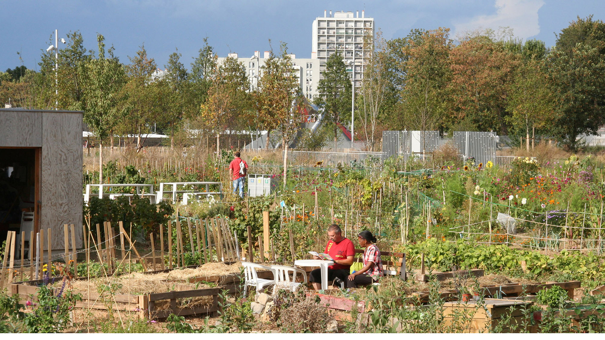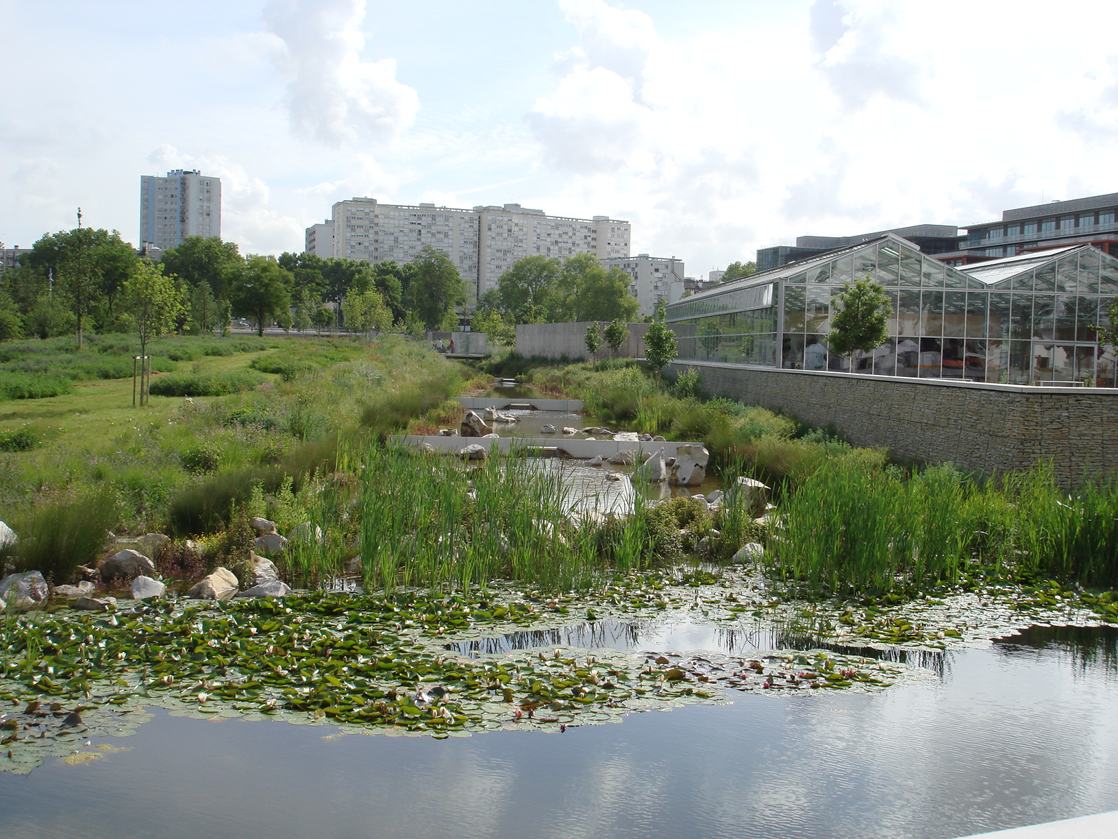 Der Park des Docks liegt wie ein Gelenk zwischen dem Zentrum von Saint-Ouen und dem neugebauten Dock-Quartier und bietet auf 12ha Fläche unterschiedlichste Aktivitäten. Der Boden wurde saniert und als Gelände mit Mulden und Erhebungen angelegt. Darin sind, differenziert nach ihrer Frequentierung, natürliche oder gärtnerische Nutzungen eingebettet: eine Blumenwiese, ein Gewächshaus für öffentliche und pädagogische Angebote, Spielflächen und Kleingärten. In den Versickerungsflächen und natürlich belassenen Bereichen kann sich die Fauna ungehindert entfalten und wird zum Observatorium für Molche, Libellen, Frösche, Vögel und Insekten.