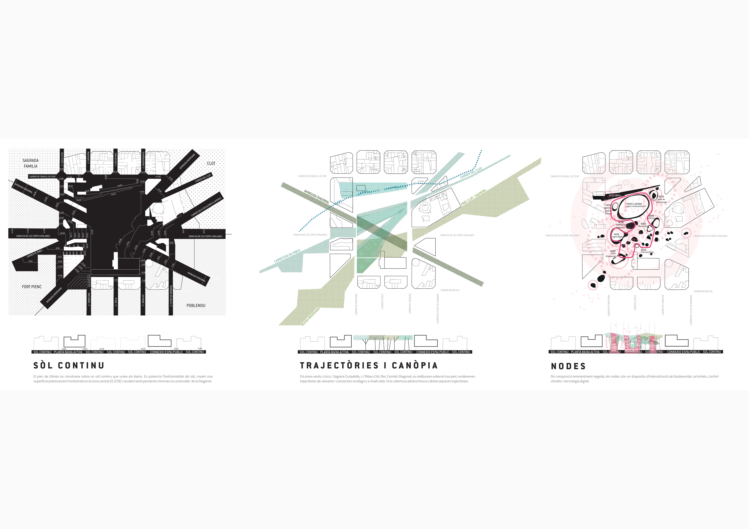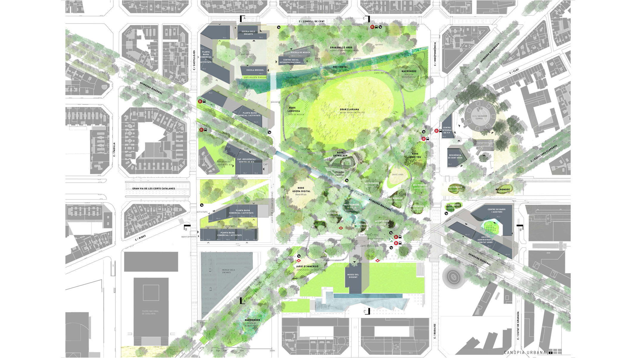 Der hybride Platz-Park ist als neues städtisches Ökosystem am Kreuzungs- punkt der drei Hauptverkehrsachsen von Barcelona entworfen. Das ungewöhnliche Konzept stellt einen natürlichen Austausch zwischen Himmel und Untergrund her, indem die wasserundurchlässige Oberfläche des Kreisverkehrs entsiegelt und der Boden angereichert wird. Darauf wird ein wachsender Pflanzenschirms implementiert, die „Canopia Urbana”, die als leistungsstarker Regulator des Stadtklimas fungiert. Aktiviert wird dieses Dach durch dichte Naturzonen, die sogenannten "Nodes", die ein vertikales Ökosystem bilden. Sie erfrischen die Stadt und fördern gleichzeitig die Biodiversität.