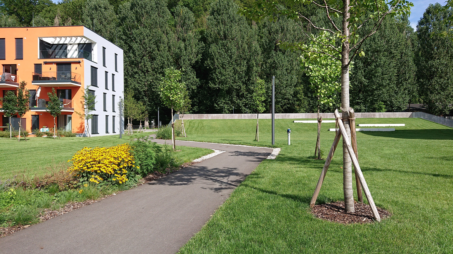Das Freiraumkonzept für das ehemalige Kasernenareal bindet die Neubebauung stadträumlich in die vorhandenen Strukturen ein und bietet sowohl für Bewohner als auch die angrenzenden Nachbarschaften vielfältige Aufenthaltsmöglichkeiten. Dabei werden Teilbereiche in Bezug auf Urbanität und Öffentlichkeit unterschiedlich gestaltet, aber durch ein kohärentes Gesamtkonzept schlüssig zusammengeführt.