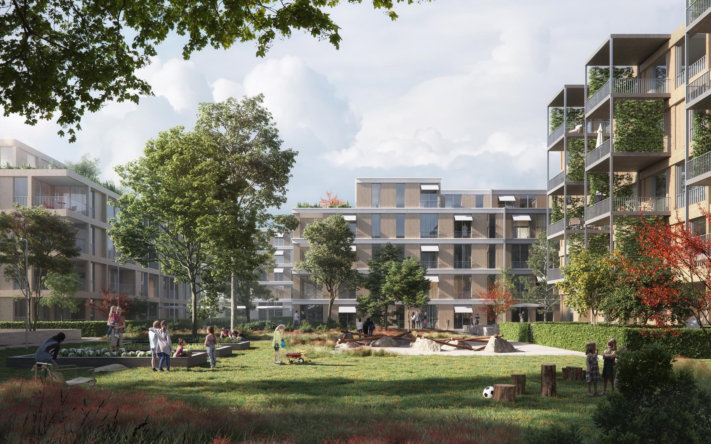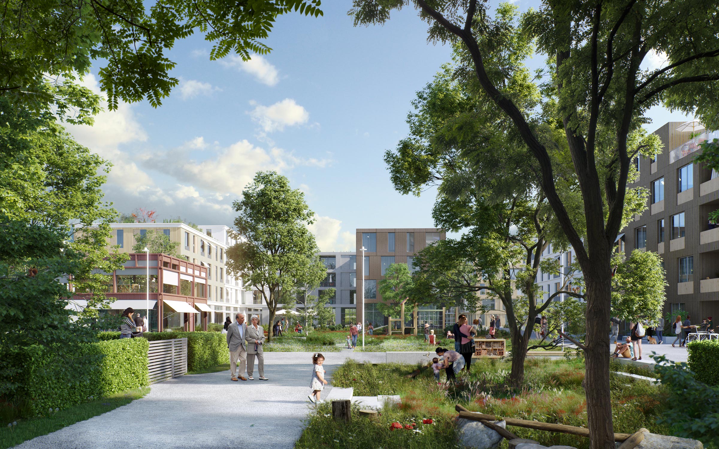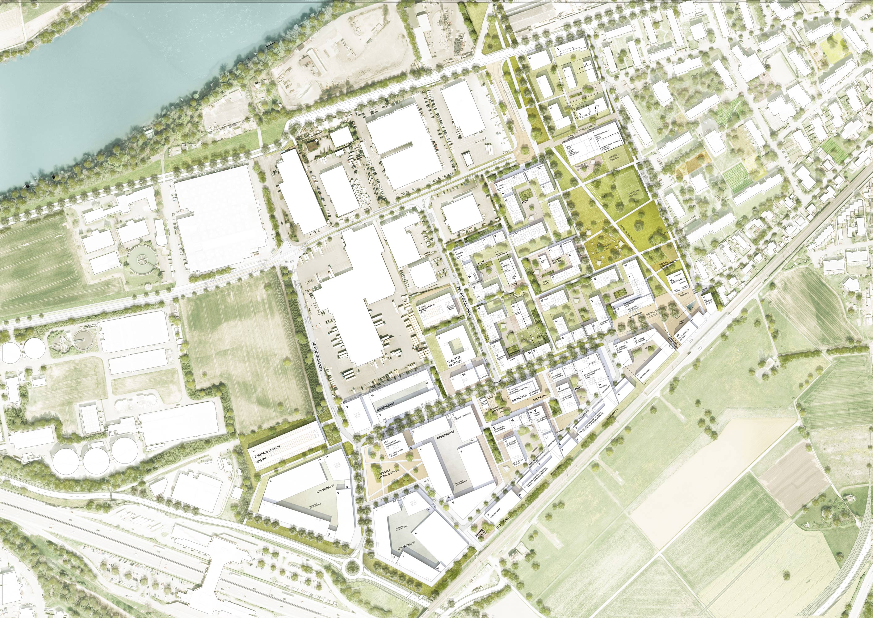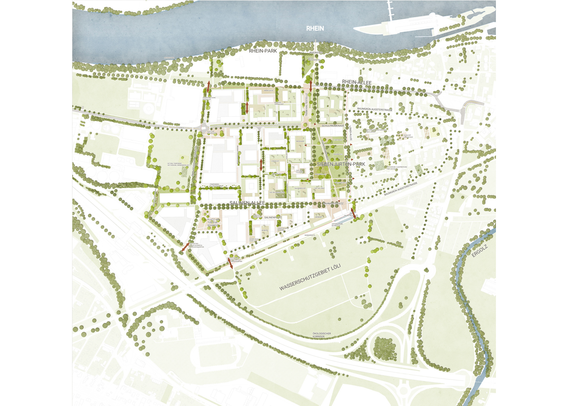 Leitbild für die Entwicklung der Freiflächen sind die landwirtschaftliche Geschichte des Ortes und der Transformationsprozess an sich. Wesentliches Element ist dabei ein zentraler Park, der die erforderlichen Schul-und Freizeitnutzungen aufnimmt und die angrenzenden Quartiere sowie Tram- und Bahnhaltestelle miteinander vernetzt. Langfristig entwickelt sich der Park bis zum Rheinufer und verortet das Quartier im Landschaftsraum Rheintal. Im den Quartieren werden vorhandene Grünstrukturen aus dem agrarischen Landschaftsraum in das Freiraumkonzept integriert und durch Selbstversorger- und Familiengärten als Aneignungsflächen für die Quartierbewohner ergänzt.