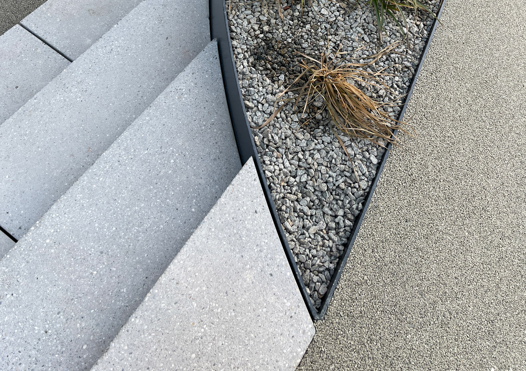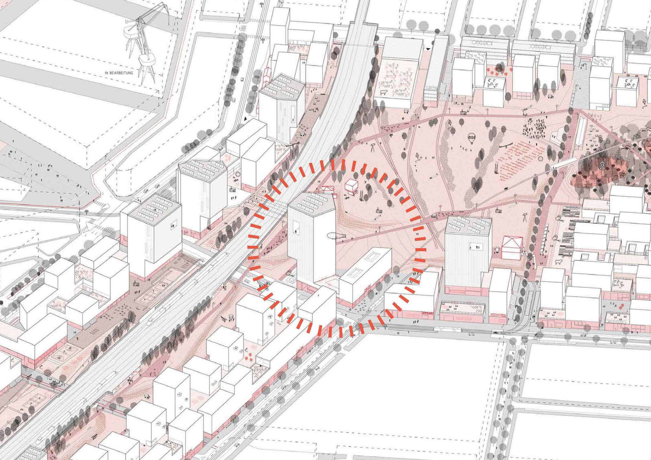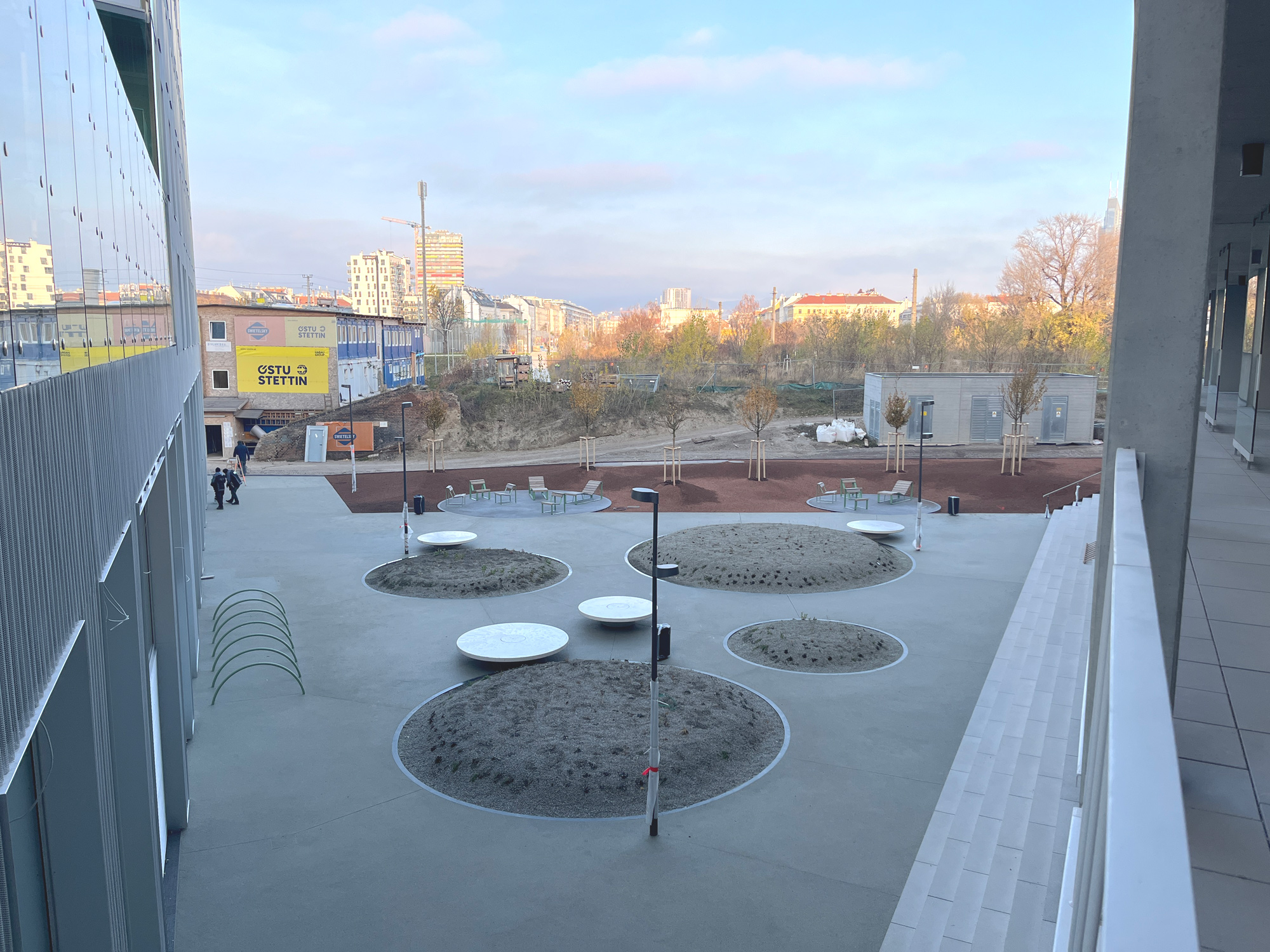 Kreise sind das wesentliche Gestaltungselement der Freiraumplanung, die einen eigenständigen und markanten Kontrast zu den vieleckigen Gebäude- volumina bildet und dabei doch eine „vermittelnde“ Geometrie mit hohem Wiedererkennungswert besitzt. Durch die Form ergibt sich ein Wechselspiel aus befestigten Flächen und ausgestanzten Pflanzfeldern, die sich als gemeinsame Formsprache sowohl im Hofbereich im Erdgeschoss, als auch auf der Dachterrasse zwischen den beiden Gebäudeteilen wiederfindet.