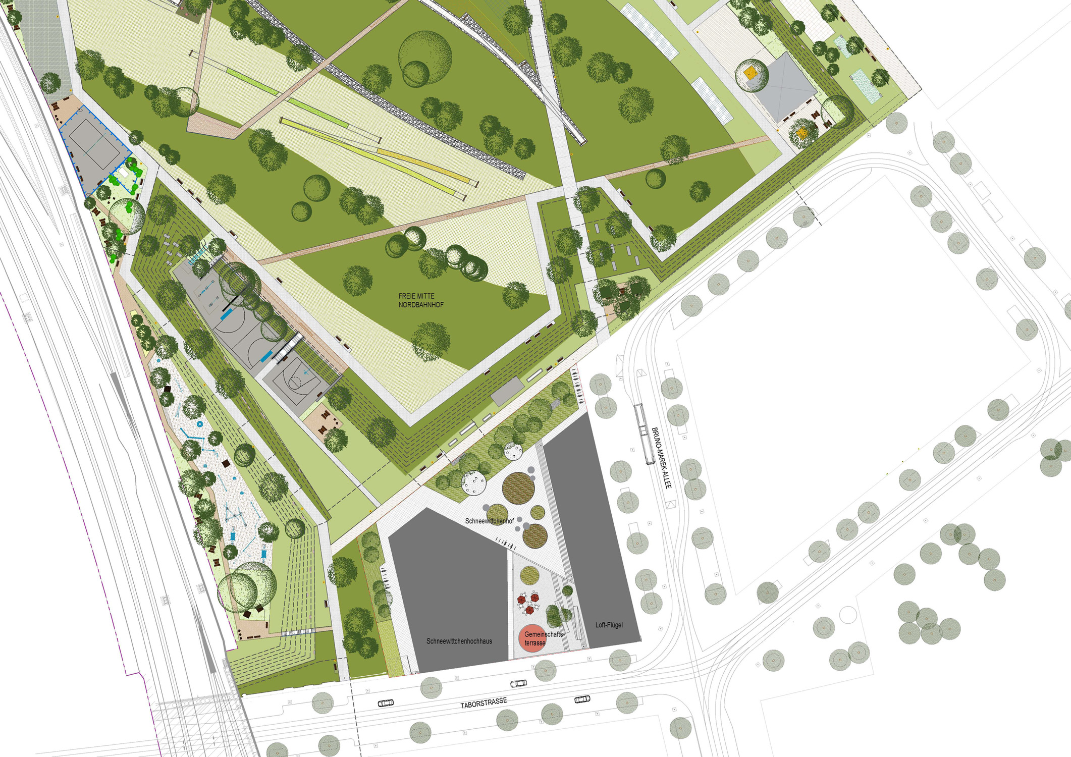 Freiflächen an Hochhaus und Loft-Flügel