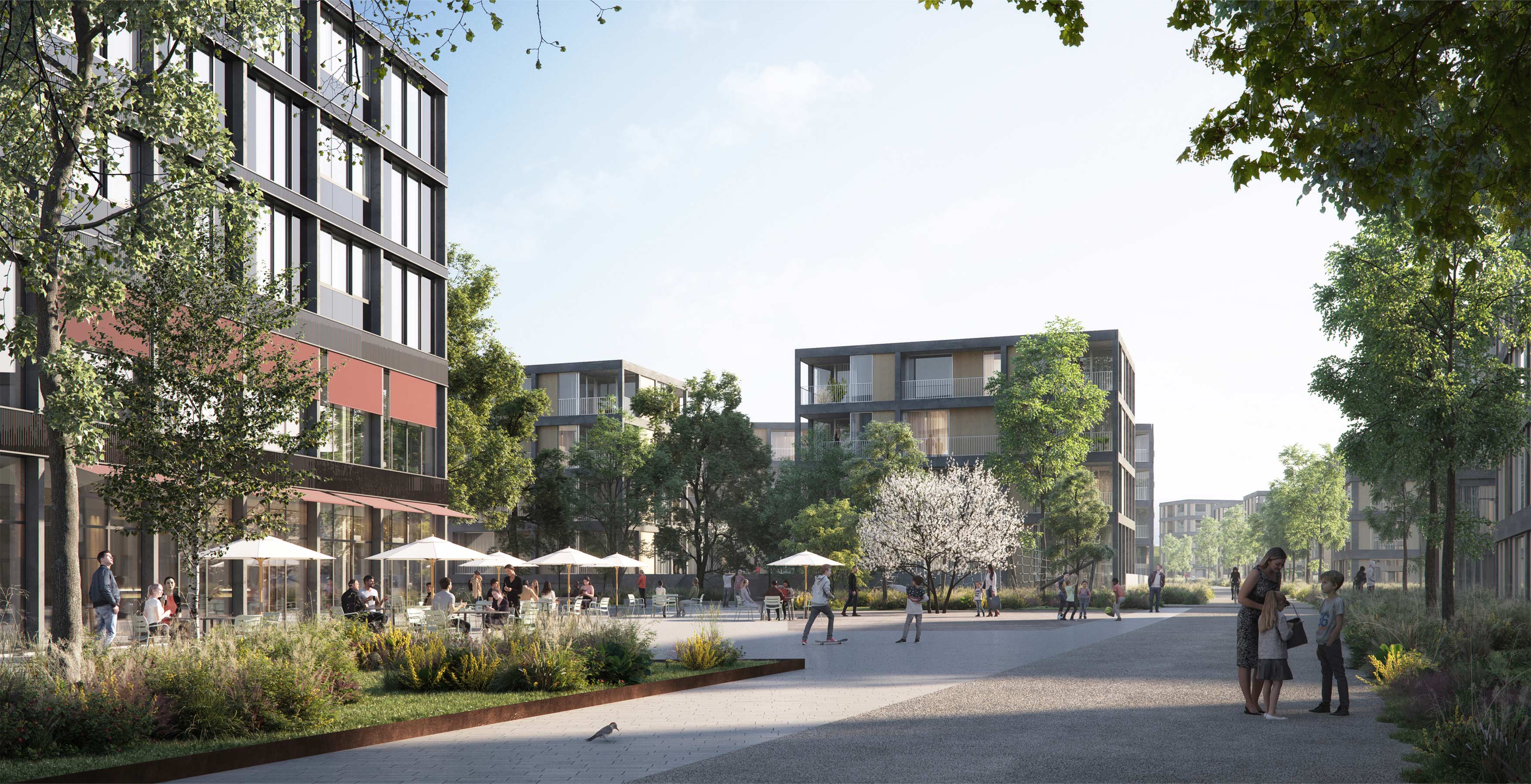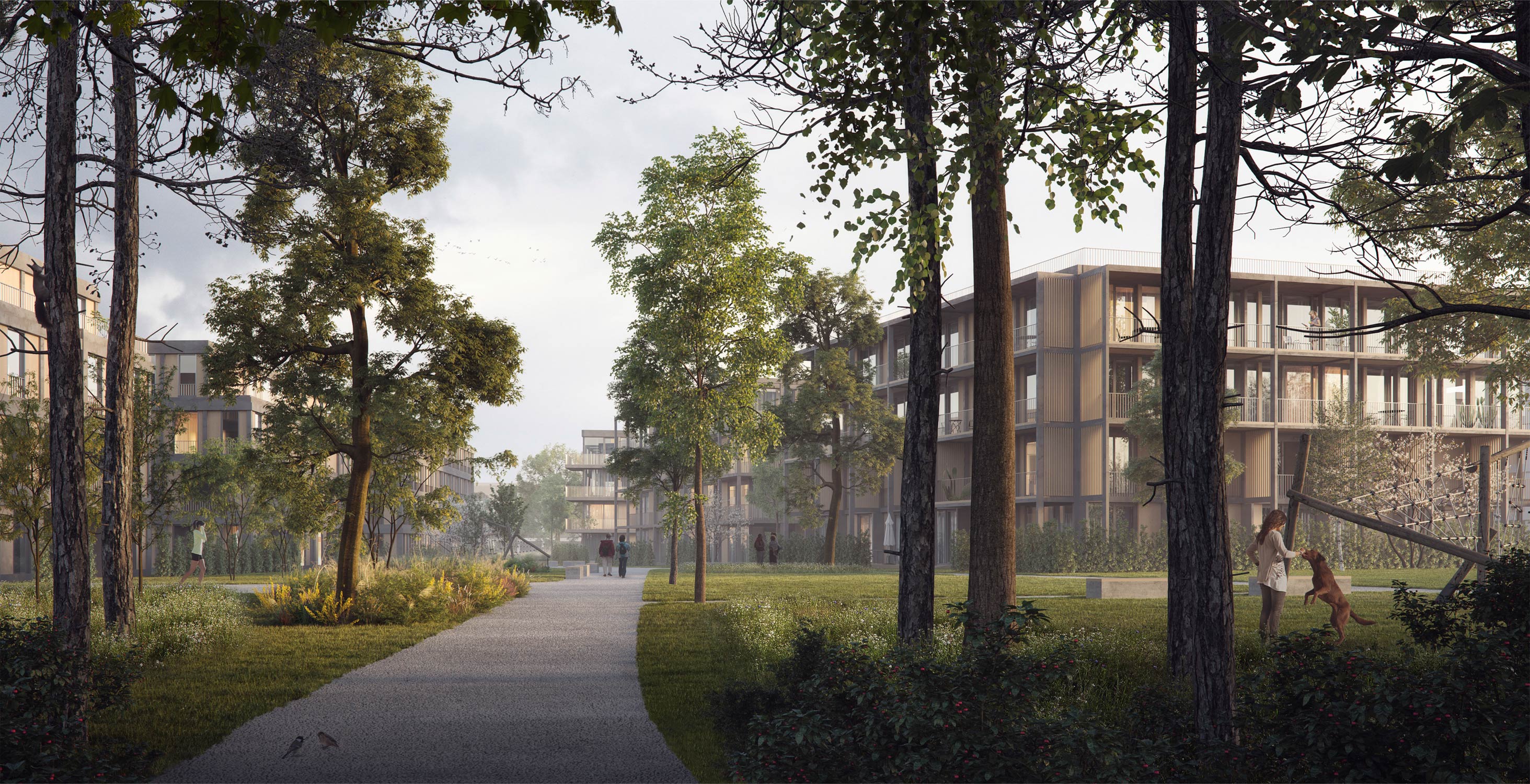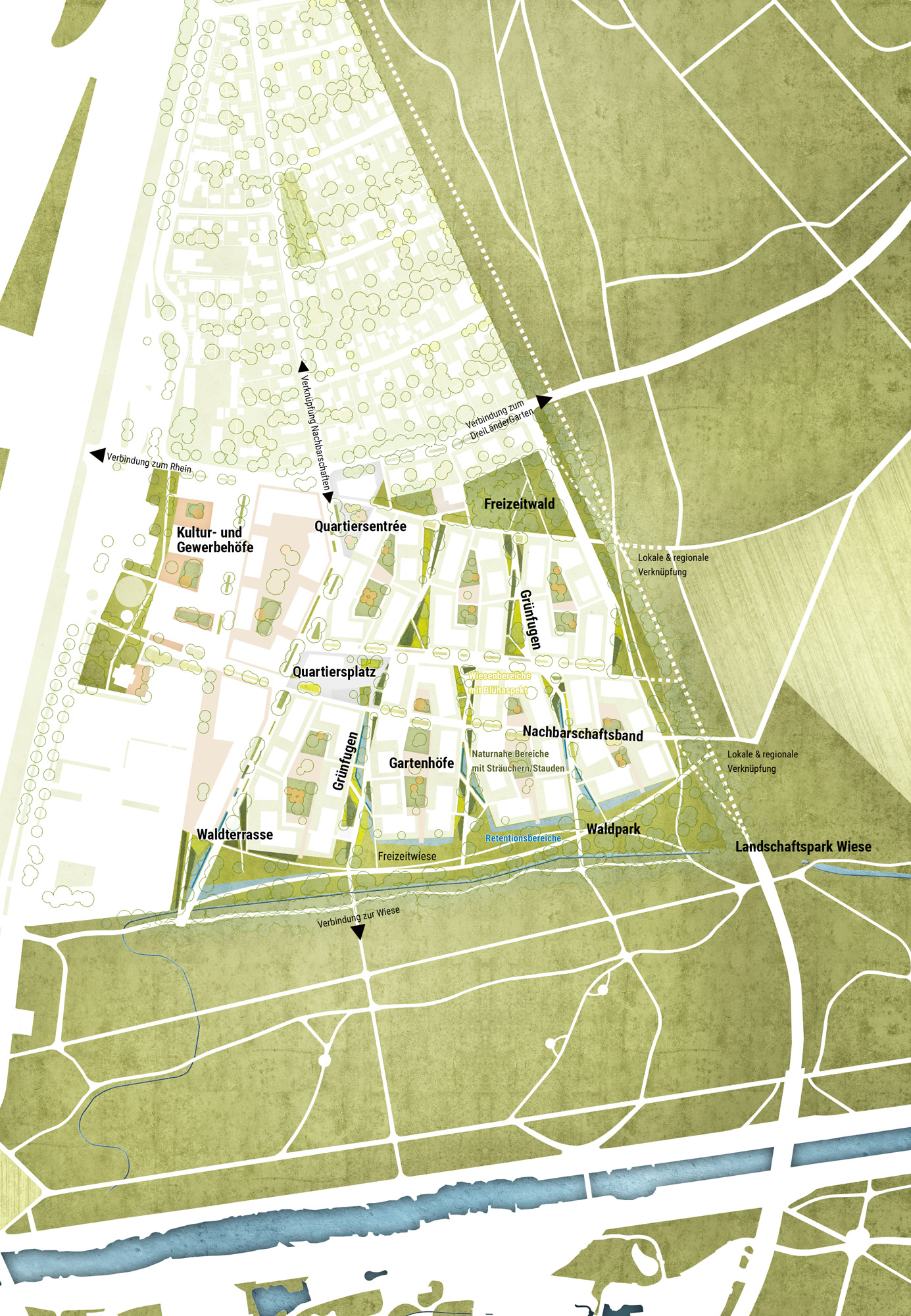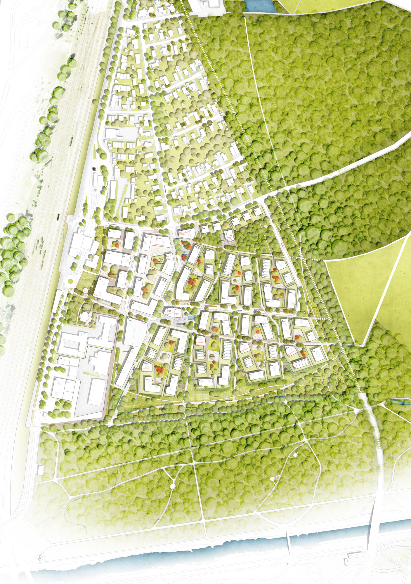 Das städtebauliche Konzept sieht eine Quartiersentwicklung vor, deren jeweilige Ausbaustufen in sich funktionieren. Der grüne Waldsaum fasst die neue Stadtstruktur und bildet eine rahmende Kulisse. Die öffentlichen Grünflächen haben einen hohen Anteil an naturnah gestalteten Flächen. Durch die Integration von Retentions- und Versickerungsflächen werden Bereiche für Ökologie und Entwässerung genutzt, was zu einer hohen Flächeneffizienz bei gleichzeitig hohem Freizeitwert führt.